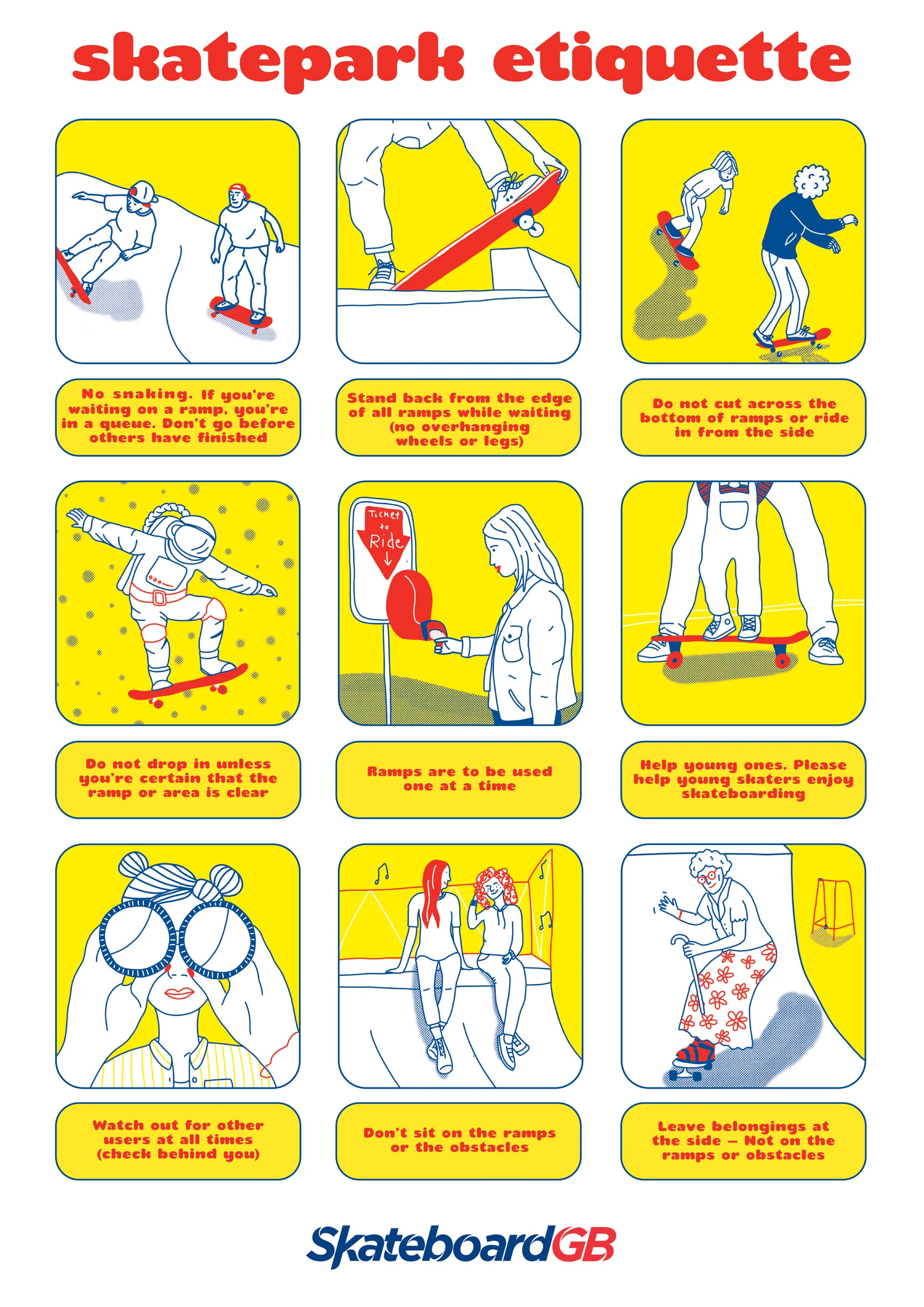 Follow basic skatepark etiquette (see image & Link);